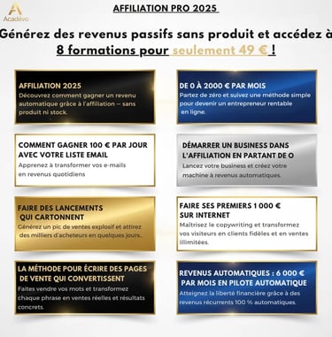 Avec le programme Affiliation Pro 2025 signé Acadévo, vous allez apprendre à bâtir une machine à revenus passifs en partant de zéro.